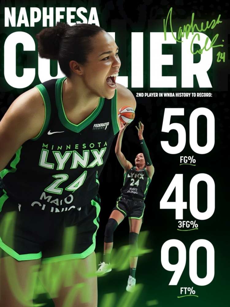 据统计,山猫大将娜菲莎-科利尔本赛季常规赛场均出战33.3分钟,砍下23.6分7.5篮板3.3助攻1.7抢断1.6盖帽,投篮命中率为53%,三分命中率达40.3%,罚球命中率为90.6%,成功跻身180俱乐部!